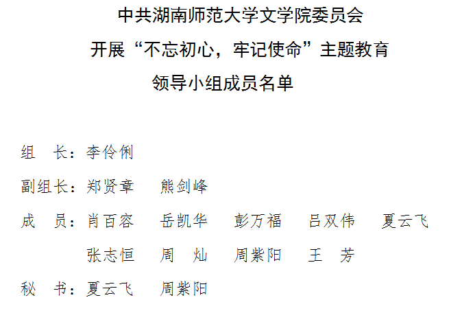 中共湖南师范大学大象影视大全在线观看委员会开展“不忘初心,牢记使命”主题教育领导小组成员名单