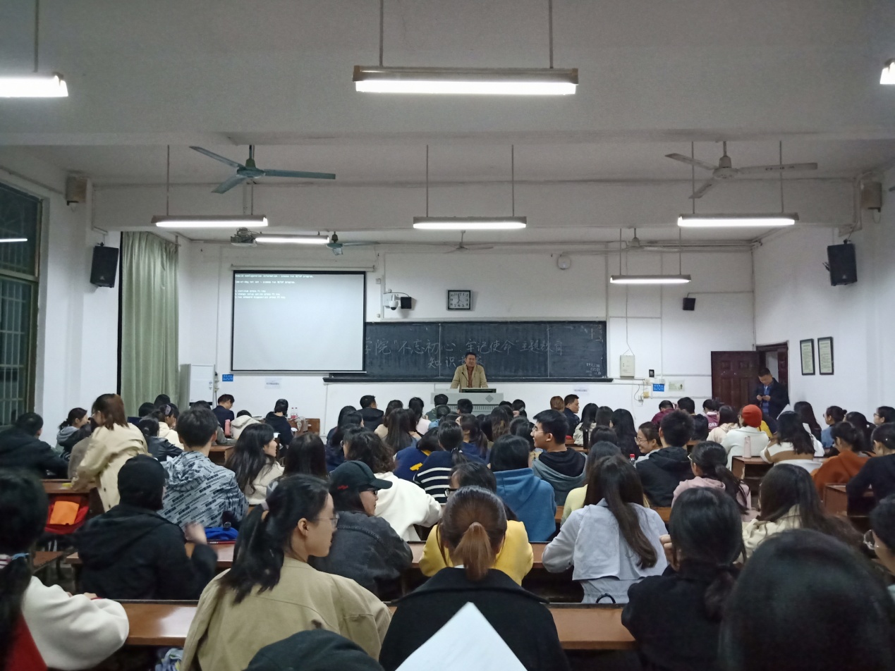 为深入学习贯彻习近平新时代中国特色社会主义思想,检验学习效果,真正达到理论学习有收获的目标,进一步推动主题教育深入开展,2019年11月13日晚7点,学院在文渊楼316教室举行“不忘初心、牢记使命”主题教育理论知识竞赛,院党委办主任夏云飞、院学工办主任周灿担任监考,院党委书记李伶俐、副书记熊剑峰到场巡考。