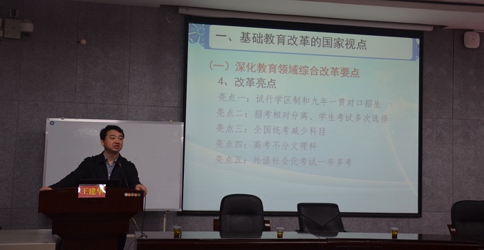 王建华主要从基础教育改革的国家试点、基础教育改革发展的形势与任务、基础教育改革的学校探索三个方面对基础教育进行阐述。他首先向在座学员们介绍了深化教育领域综合改革的核心目的、基本方向、政策要点和改革亮点,并对改革的重点做出了详细的分析。