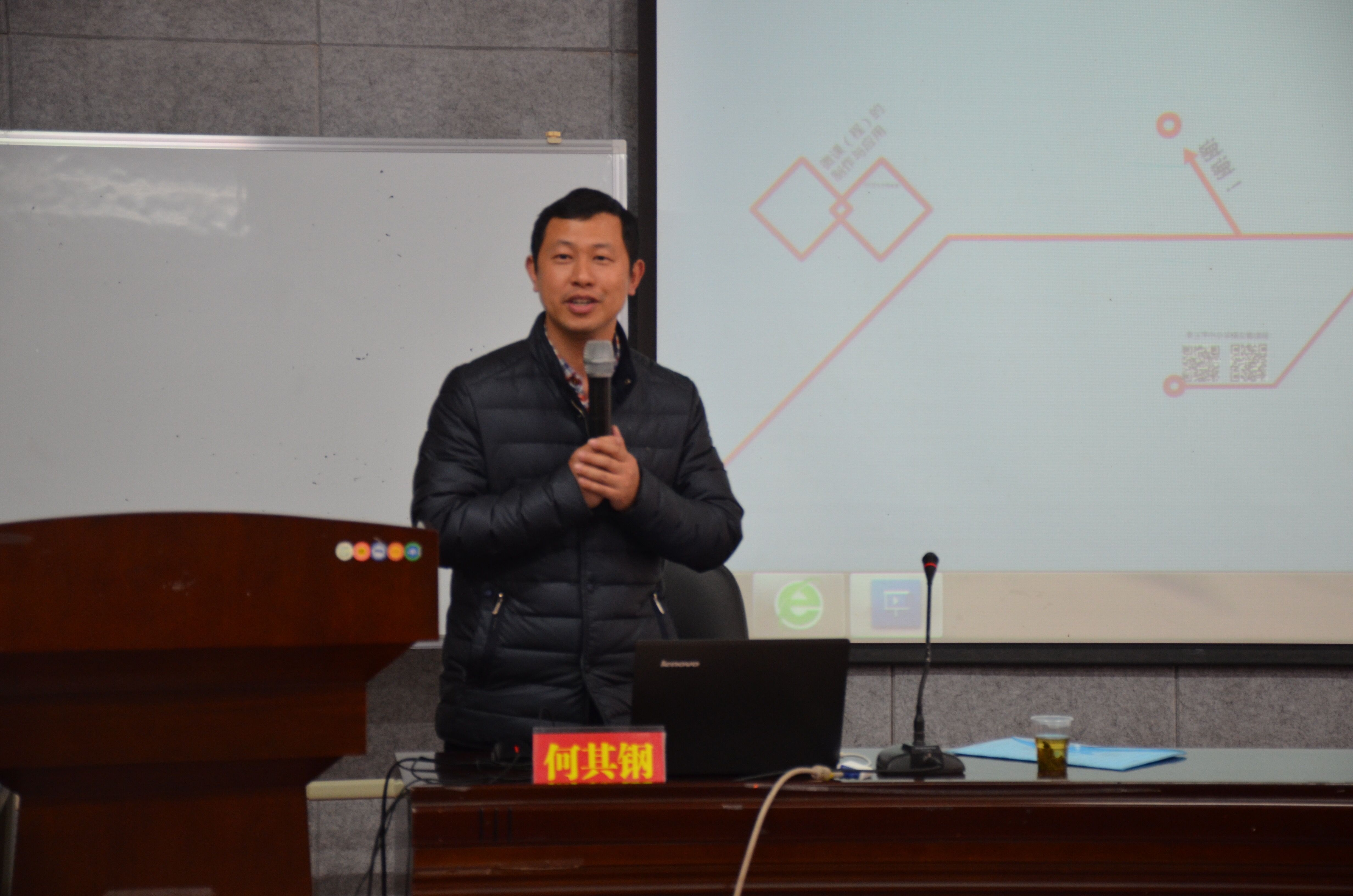 何其钢从三个方面:为何要将信息技术与教育教学深度融合?如何将信息技术与教育教学深度融合?如何将微课应用在学校的管理、德育、教研和教学?向学员们着重介绍了微课的重要性。