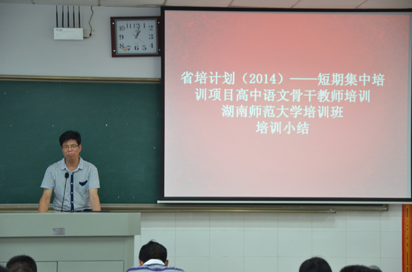 (记者刘雨溪)万里无云,暑气未退,相聚总是短暂。8月29日上午,省培计划(2014)——短期集中培训项目高中语文骨干教师培训湖南师范大学培训班来到离别时刻。湖南师范大学大象影视大全在线观看教授、项目首席专家张良田,大象影视大全在线观看成教办主任彭万福,学工办主任夏云飞,副教授李霞,团委副书记周灿以及省培全体学员出席结课典礼。学员张世程担任主持。