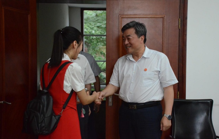 当日下午,我校党委书记李民、校党委副书记兼工会主席刘起军、副校长周俊武、纪委书记唐贤清在校党委宣传部部长晏昱、副部长王邵平、副部长蔡颂、我院党委副书记熊剑峰、学工办主任周灿等人的陪同下在校长办公楼看望慰问高子妍。李民对高子妍取得的优异成绩表示祝贺,同时提到“天天见”、“天天新”、“天天深”不是一句空洞的口号,而是反映理论武装规律的科学命题。从“见”到“新”、再到“深”,是一个螺旋式上升的过程,更是当代大学生需要破解的时代课题。面对领导老师的鼓励与教诲,高子妍感谢学校、学院的培养,并表达了继续努力的决心。