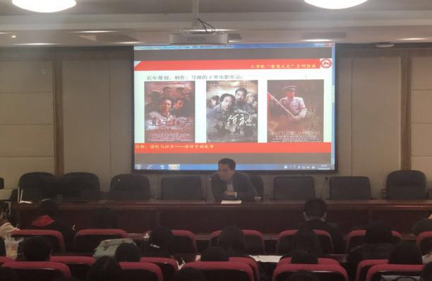 周琦导演主要以近年筹划、制作、导演的《革命到底》、《领袖1935》以及《通道转兵》三部电影作品为例,向在座的师生讲述了其在电影制作中的一些鲜为人知的故事,并分享了选材、提炼与构思等许多宝贵的创作经验。周琦导演介绍了电影《革命到底》的创作缘起。在一次重走长征的路途中,他认识了一名老红军,她每天傍晚都要去村口张望,等待心中的红军归来。经过深入访谈,周琦导演知道了这位女红军与原来追求她的男孩有个约定,待革命成功后回来娶她。以此故事为原型,电影采用谁革命到底女人就嫁给谁的轻喜剧方式,讲述了一个女人和三个男人之间的革命爱情故事。在分享《领袖1935》的创作经验时,周琦导演首先道出了他对中国历史的深刻理解,在中国革命与建设中,领袖的作用特别大,基于这一认识,便有了《领袖1935》这一作品的诞生。在占有丰富的材料后,周琦导演又亲临历史现场,不断往返在毛泽东与周恩来两人住房的小路上,藉此深入人物内心,既不刻意拔高领袖人物,又没有将博古、李德等早期革命历史人物概念化,最大限度地还原了历史真实。