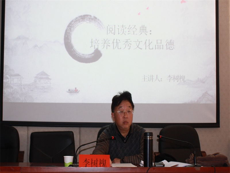 (通讯员 马曌)12月19日中午,我院关工委于216报告厅举办以“阅读经典:培养优秀文化品德”为主题的年度教育活动。此次活动由关工委老师李树槐担任主讲人,我院团委副书记陈胜冲,17级辅导员王倩出席,百余名学生共同参与。