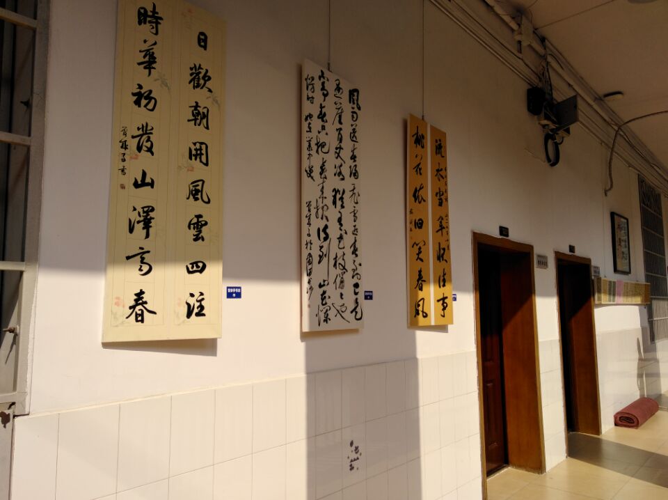 现代汉字书法是一种创新,在教学楼走廊布展也是一种创新,既不为名,又不为利,低调中见深情,朴实中现真功,彰显的是对母校的回报和对艺术的追求,展现的是文人的气质和风骨!