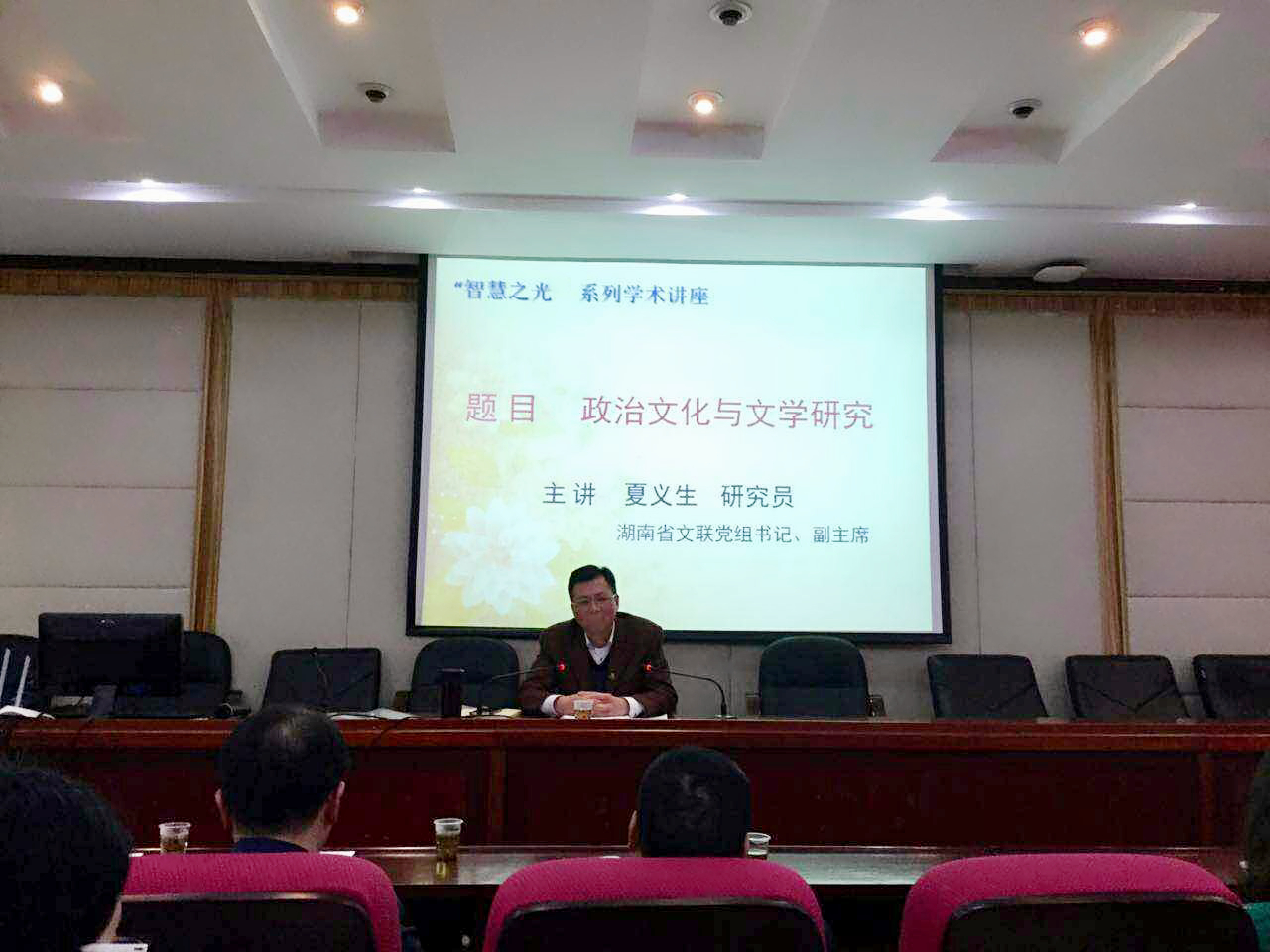 (通讯员段志苹谷琪琪)4月13日下午,大象影视大全在线观看在216教室举办了“智慧之光”系列学术讲座,特邀湖南省文联党组书记、湖南省作协副主席夏义生,做了题为“政治文化与文学研究”的专题讲座。会议由赵树勤教授主持。