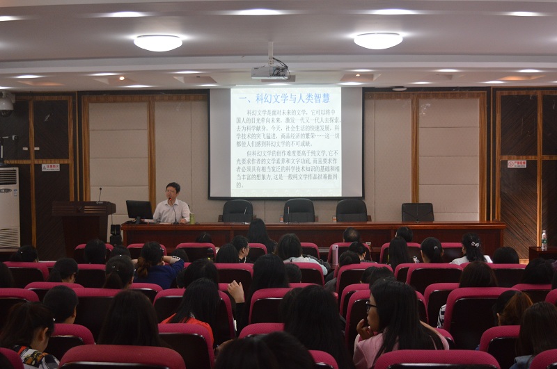 在讲座中,谭伟平教授与同学分享自己对于文学功能的认识。他认为文学的功能是不断发展变化的,其趋势是教化功能弱化、审美功能存留、休闲功能抬升和智慧功能显现,并以科幻文学为例探讨了文学的智慧功能。首先,以大量的科幻小说、科幻电影作为切入点,论述了科幻文学与人类智慧之间的关系。他认为科幻文学的创作难度要高于纯文学,它要求作者必须具有相当宽泛的科学技术知识的基础和丰富的想象力。其次,从菲利普·K·迪克的《城堡中的男人》到J·K·罗琳的《哈利波特》及托尔金的《魔戒》再到刘慈欣的《三体》,以图文结合的方式展现了科幻文学的诞生和发展过程。最后,谭伟平老师认为智慧功能是科幻文学的精神形态,而科幻文学的精神形态的表现形式有四种类型,分别是:1.展现人类智慧;2.拓展人生内涵;3.探求自然奥秘;4.幻想科学未来。对智慧功能的学习和探讨其目的就在于关注未来、关注发展、关注自身。