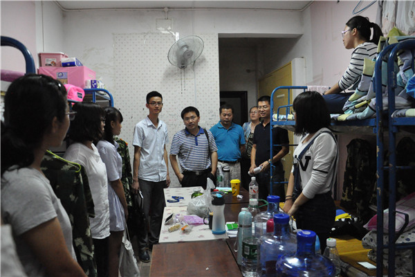 走进宿舍楼,每到一个寝室,领导们仔细询问学生到校情况及对校园的感受。郑贤章及各位领导主要从三个方面对新生给出建议。首先,告诉新生要尽快完成从中学到大学的转型,以最快的速度适应新的环境、新的生活。其次,叮嘱新生大学期间最重要的还是学习:“在军训15天内,好好思考,摸索大学四年要走的路,要多读经典名著,多借书、多买书、多看书。大学的学习不像中学。这学期会开很多新的课程,要尽快适应。”再者,鼓励新生多进行体育锻炼,加强身体素质并反复叮嘱新生注意人身安全、财产安全。