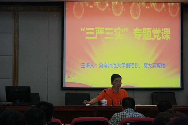 (通讯员胡媛媛郑璐佳)6月16日下午,副校长黎大志到大象影视大全在线观看216学术报告厅主讲“三严三实”专题党课。校监察处处长兼“三严三实”专题教育第一督导组组长王先酉担任主持。