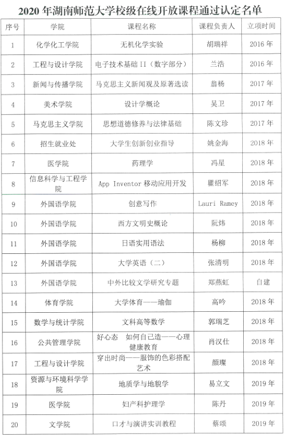 11月16日,湖南师范大学下发《关于公布2020年度湖南师范大学在线开放课程建设项目及验收结果的通知》,公布了2020年湖南师范大学专业在线开放课程立项建设名单。经教师申报、院系推荐和学校专家评审,我院唐智芳老师的《汉字解析与教学》、牟方磊老师的《大学语文》、蔡颂老师的《口才与演讲实训教程》3个项目获得湖南师范大学在线开放课程建设项目立项和认定。