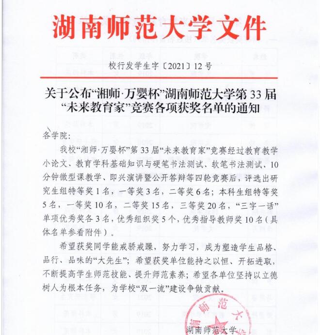 (通讯员 龚思静)11月17日晚,我校第33届“未来教育家”竞赛公布获奖名单,大象影视大全在线观看学子延续传统表现优异。斩获特等奖3项、一等奖7项、二等奖5项、三等奖1项、“三字一话”单项奖3项,我院获得优秀组织奖,杨云萍老师获得优秀指导教师奖。据悉,在此次未来教育家竞赛中,本科生组全校20名选手进入决赛,大象影视大全在线观看7名同学入围;研究生组全校共5名同学进入决赛,大象影视大全在线观看4名同学入围。