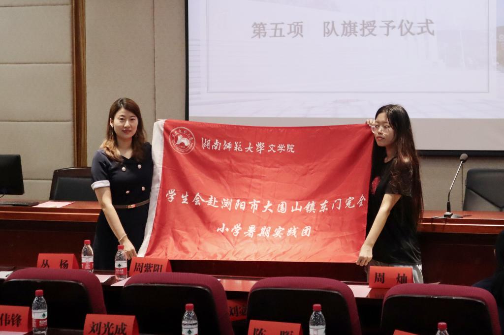 各团队指导老师给队长授旗并进行合影,出征仪式结束。此次会议提高了暑期社会实践团队成员的安全意识,为暑期社会实践活动的顺利开展奠定了基础。