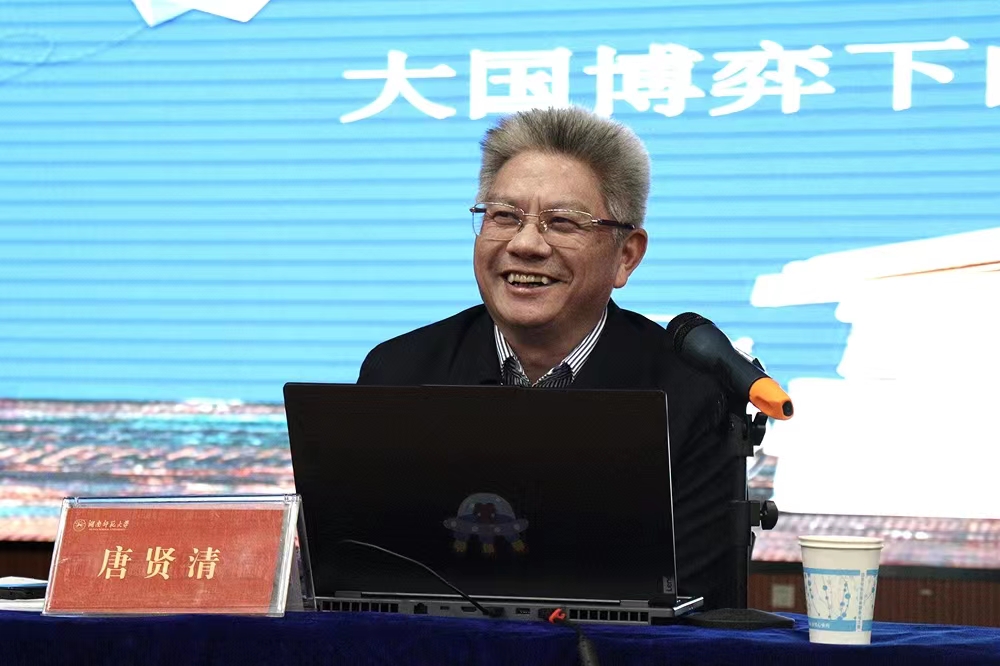 (通讯员 文静 唐子涵)11月16日晚,校党委委员、副校长唐贤清教授在励德讲堂为我院2022级本科生讲授以“大国博弈下的乌克兰危机”为主题的“形势与政策”课。讲座由院党委副书记刘宓蜜主持,院团委书记、2022级辅导员周紫阳,2022级辅导员彭君出席。
