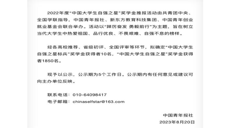 (通讯员 田昊彤)8月20日,由共青团中央、全国学联指导,中国青年报社、新东方教育科技集团、中国青年创业就业基金会联合举办的2022年度“中国大学生自强之星”奖学金推报活动公示获奖名单。我院2019级汉语言文学(基地)班熊雨涵获此称号,受公示表彰。