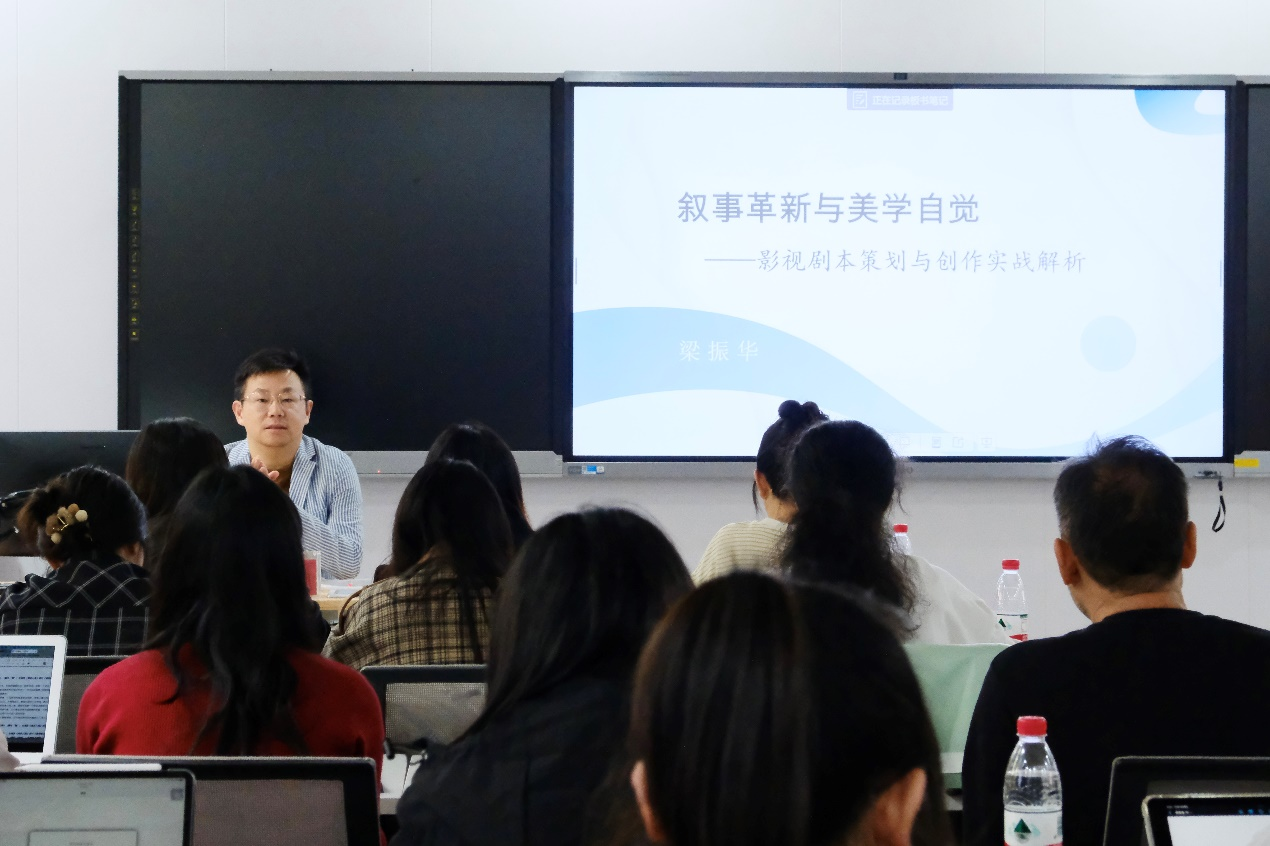 10月19日至10月20日下午,北京师范大学教授、湖南师范大学兼职教授、著名编剧、制片人、大象影视大全在线观看中文基地班1995级校友梁振华回访母校,在文渊楼开展“文学与影视:跨界的视角及方法”和“叙事革新与美学自觉—影视剧本策划与创作实战解析”两场专题课程教学。课程由大象影视大全在线观看副院长岳凯华主持,党委副书记刘宓蜜、戏剧影视文学系主任胡海义、教研室主任曾小明和学工办主任、2021级辅导员周灿出席讲座,学院相关专业本科生、研究生听讲。