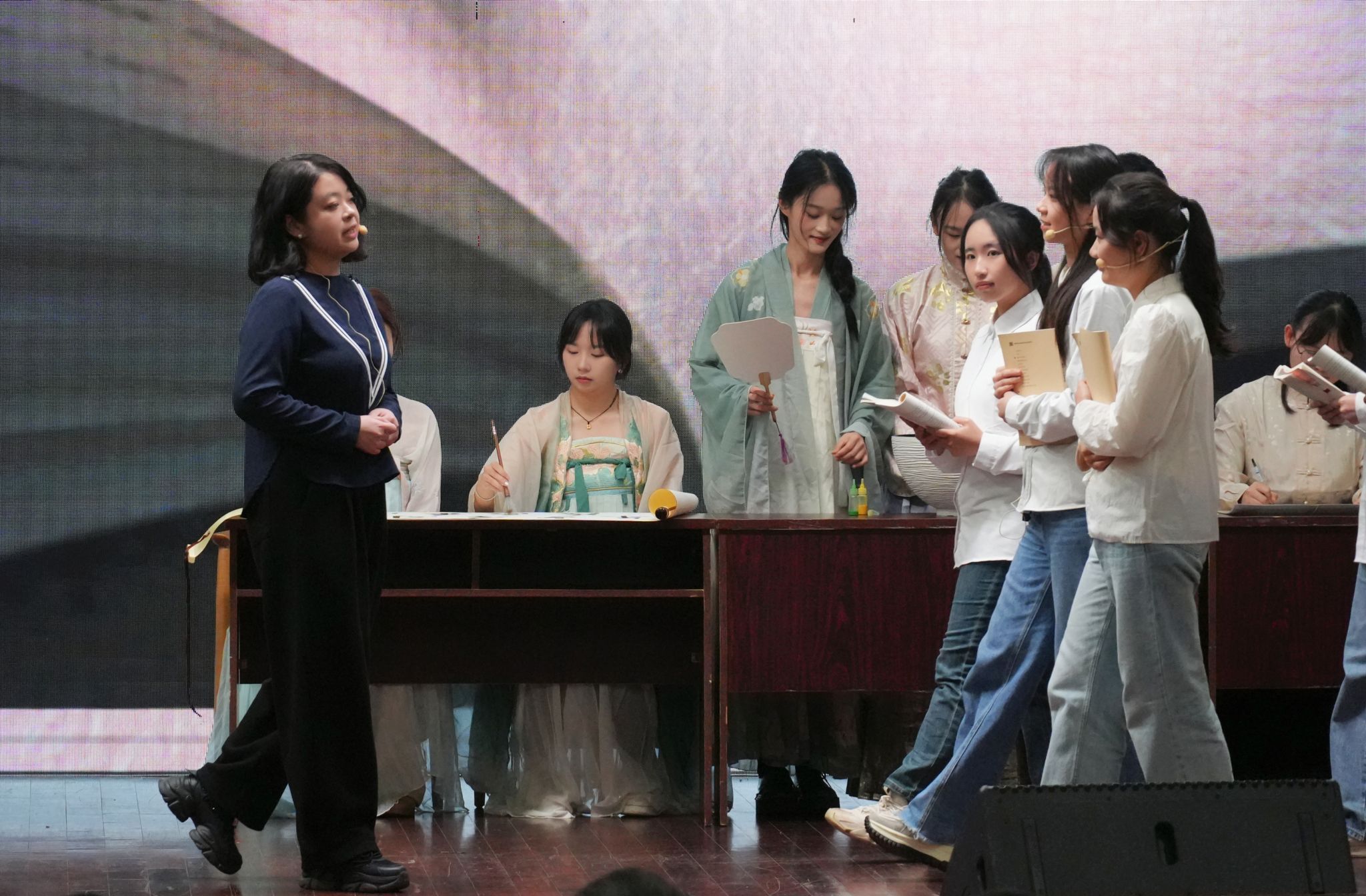 风采展环节由张家界所饰演的陶行知先生的吟诵开场,与学生共论“知行合一”教育理念,共盼百年后华夏教育伟业,向观众展现了上世纪学子谈论教育发展的场景。陈展带领新时代学子共赏橘子洲头,将《沁园春》与橘子洲相结合,阐明了陶行知先生“行是知之始,知是行之成“的教育理论。同时,6班学子身着汉服,完美展示舞剑、泼墨、制扇等中华优秀传统文化。风采展最后,刘宓蜜与彭君对6班三年来汲汲求学、献身教育的行为表达赞扬及期盼,6班学子及文院同学共同呐喊班号,气势磅礴。