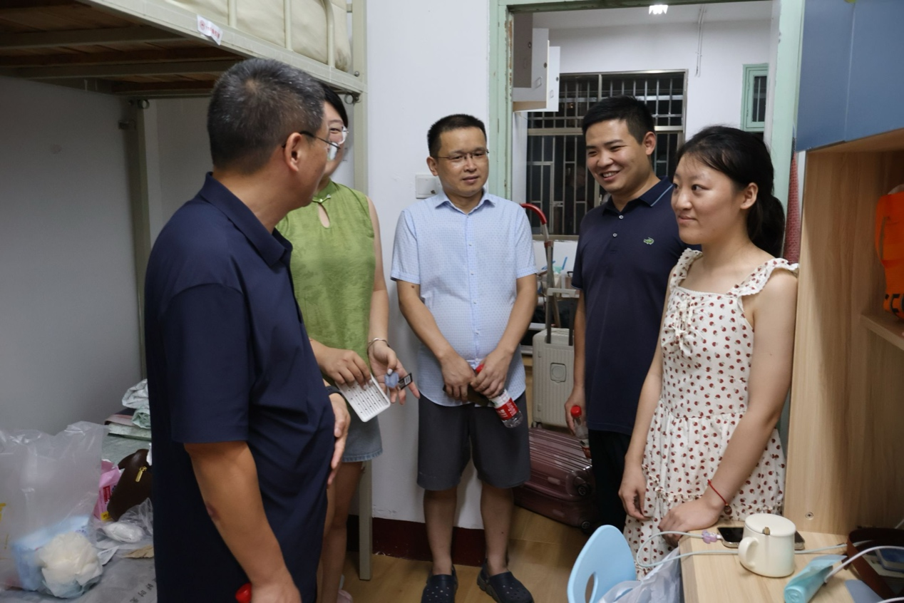 在咸嘉湖校区,院领导走访研究生寝室,了解新生入学适应状况,吕双伟逐一检查各寝室的水电设施、通风采光等情况,要求随行工作人员详细记录存在的问题,帮助新生尽快适应学习生活。学院领导针对新生提出的相关问题进行解答,嘱咐新生要提高安全意识,注意防范诈骗,妥善保管个人财物,合理规划学习与生活,保持积极心态。