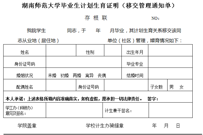 湖南师范大学毕业生计划生育证明(移交管理通知单)