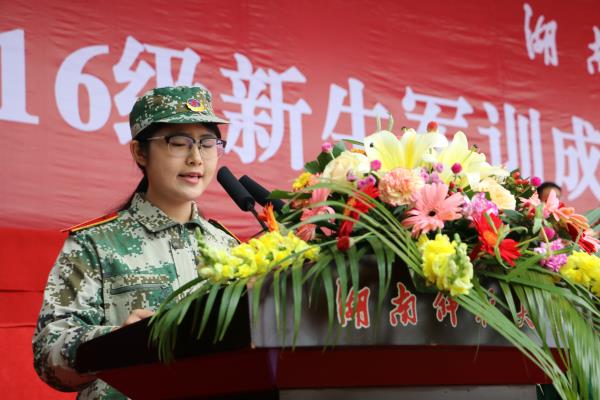 我院2016级学子刘玉洁代表全校本科生在总结大会上发言。她回顾军训时的美好记忆,并代表全体新生祝福师大,感谢领导、老师、教官。
