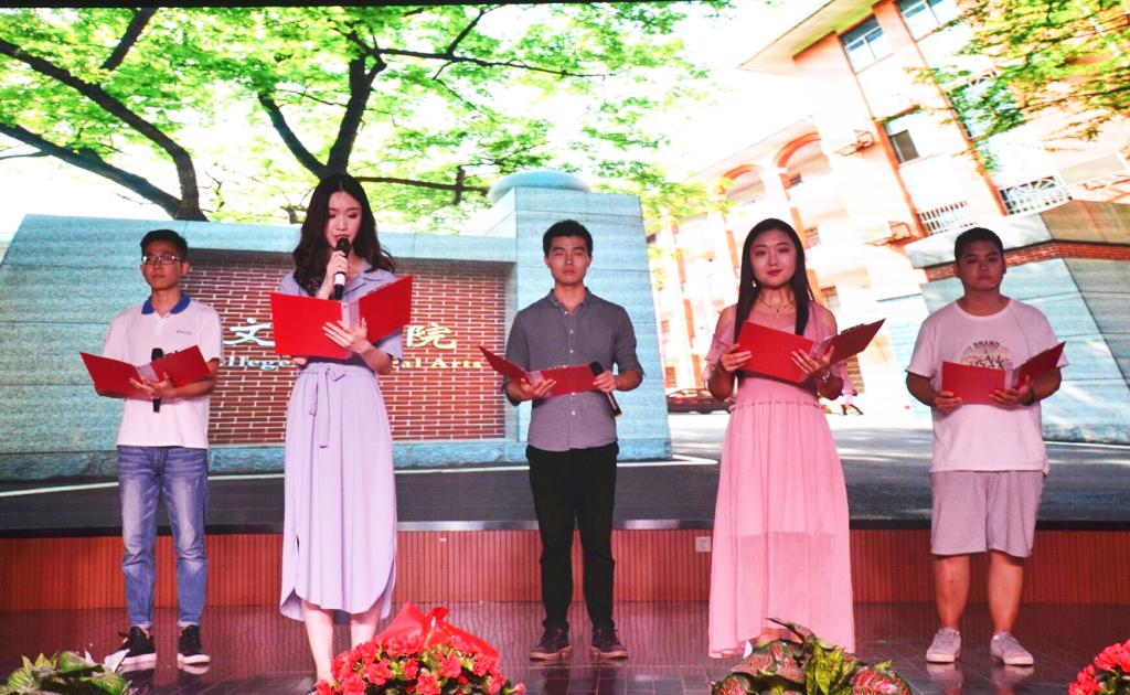 演出过程中,2015级辅导员陈胜冲上台分享感受:从张公岭到二里半,从十八到二十二,他见证了同学们的成长,希望同学们毕业后都能越来越好,实现自己的梦想。毕业生代表刘三宋感谢了老师、家长和同学四年的照顾,用风趣的语言回忆了大学四年的点点滴滴,祝愿所有毕业生都能朝光明前途策马奔腾。王梓则分享了在文院四年的感受,希望毕业生们走上社会后仍能保持学习的拼劲,不断超越自己,并永怀感恩之心,常回学院看看。