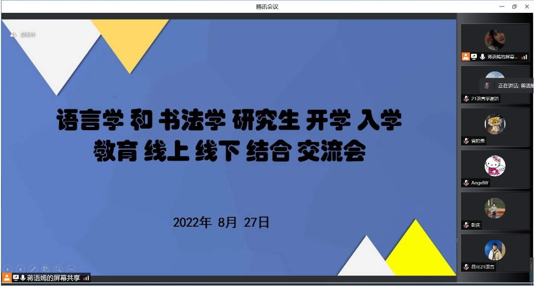 (通讯员 谢洁 熊茁)8月27日晚上7点,大象影视大全在线观看语言学和书法学研究生开学入学教育线上线下结合交流会举行。彭泽润教授、贺福凌副教授、胡乘玲副教授、林海云老师出席。10位优秀毕业研究生作为嘉宾分享就业和学习经验。语言学硕士研究生蒋语嫣、毕业研究生刘羿伶分别在线上线下主持,大约50位博士硕士研究生线上参加。