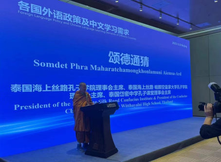 (通讯员 朱淑琪)2023年12月7日到9日,由中华人民共和国教育部主办的“2023世界中文大会”在北京举行。来自全球160多个国家和地区的政府官员、教育机构代表、知名中文教育专家汇聚一堂。热心汉语国际教育的泰国副僧王颂德通猜8日上午在“论坛4:各国外语政策及中文学习需求”的“议题2:各国中小学中文教育政策与实践”中发言,介绍了湖南师范大学彭泽润教授在泰国孔子学院(课堂)联盟主办的汉语教学教学研讨会的主旨演讲《促进汉语文本规范化,普及正词法和词意识》。