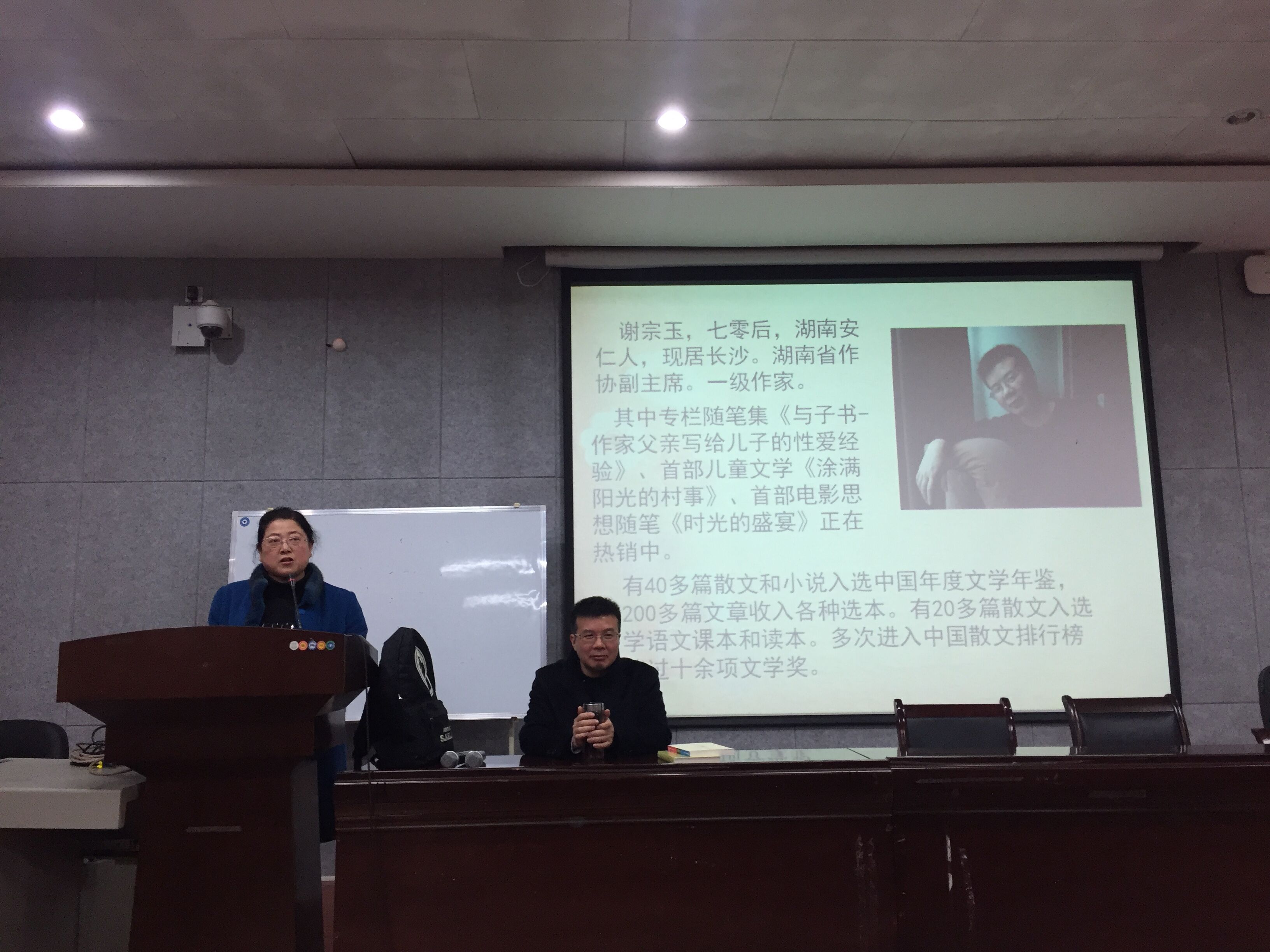 谢宗玉回顾了自己的求学经历,分享了他与写作结缘的故事,并结合亲身经历,对“中文系究竟要培养一个什么样的人?”提出了自己的见,解随后,他介绍了他的作品《与子书》和《时光的盛宴》,并为在场师生推荐了《东京物语》、《狗镇》、《美丽人生》、《朗读者》等十部思想内涵深刻的经典电影。谈到写作方法,他说,灵感的迸发源于深厚的积累,中文系的学生要博览群书,选取与自己气息相近的作家作品进行精读,并从模仿开始,逐步形成自己的语言体系,最后再进行自己的文学创作。