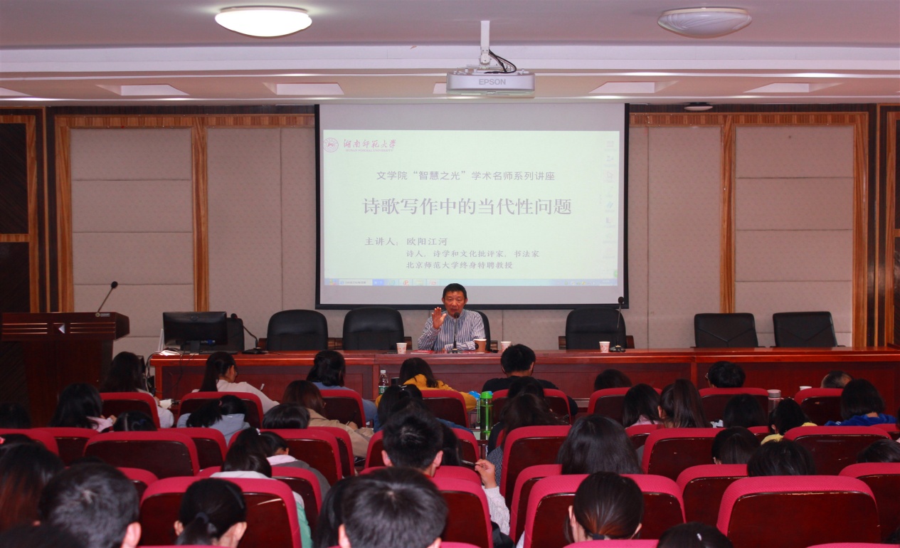 (通讯员 甄思祺 杨树菲娅 刘灿)11月3日上午,大象影视大全在线观看于文渊楼216学术报告厅开展“智慧之光”学术名家系列讲座。此次讲座以“诗歌写作中的当代性问题”为主题,著名诗人、诗学及文学评论家欧阳江河担任主讲。讲座由赵炎秋教授主持,韩少功、杨厚均、肖百容、廖述务等老师出席。