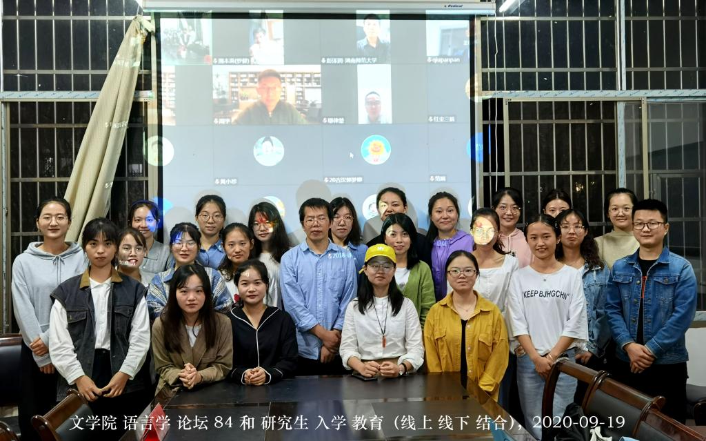 (通讯员熊茁、佘欣慰、孙玲芝)2020年9月18日晚,由大象影视大全在线观看研究生会、研究生团委主办,2020年级语言学及应用语言学专业、现代汉字书法专业研究生承办的第84期语言学论坛和入学教育,通过“线上+线下”同步的方式成功举行。这次论坛的主题是“研究生的现在和未来”,主讲人是上海师范大学博士生久西杰、湖南中医药研究院新入职的邓湘琴硕士和毕业的优秀研究生代表彭思恩、邱盼盼、周鑫琳、周宇、杨叶青等。杨合林、彭泽润、罗健3位教授线上参加,贺福凌副教授在线下参加。粟碧琴硕士生主持。
