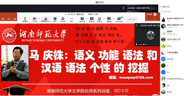 (通讯员 粟碧琴)2022年11月7日晚上,中国语文现代化学会名誉会长、南开大学博士生导师马庆株教授做客大象影视大全在线观看“智慧之光”学术名师系列讲座,题目是《语义功能语法和汉语语法个性挖掘》。讲座由中国语文现代化学会副会长、大象影视大全在线观看彭泽润教授担任学术对话人,曾常红副教授主持。腾讯会议和哔哩哔哩同步直播,来自全国高校的师生1051人参加,演讲和交流持续3.5个小时。