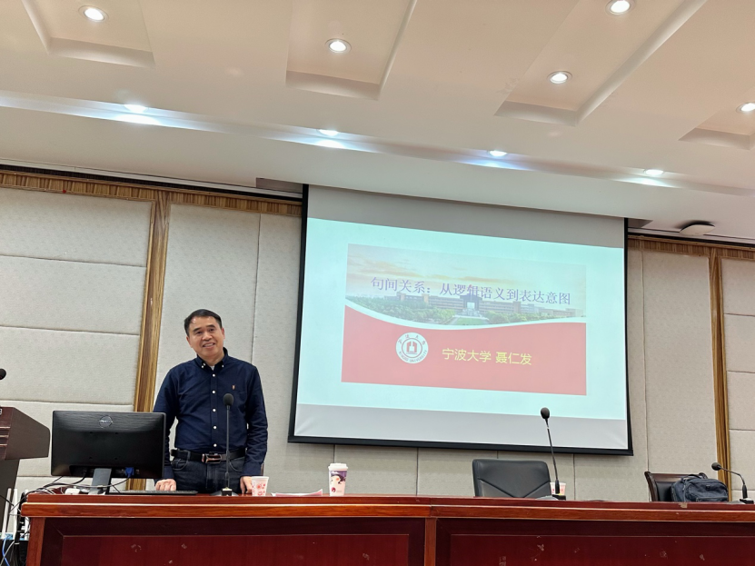 聂仁发教授从句间关系着手,从表达内容和表达意图、基于表达的句间关系类型以及句间关系与篇章三个方面对其进行分析。聂教授指出句间关系是从句义到篇章的第一步,是构建篇章的基础,论证了“事实—认知—解说”的三分格局适用于句群分析。聂教授的讲解生动有趣,在场师生均认真听讲,现场反响热烈。