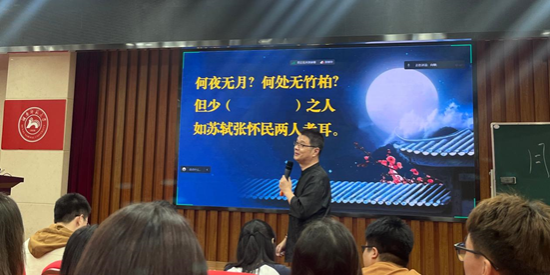 肖培东老师首先带来了一堂精彩纷呈的《记承天寺夜游》公开课,他带领同学们紧扣文本并阐释文字背后的意义,引导同学们沉浸到真实学习情境中,主动积极地阅读探究与表达,最后落脚于“种植一轮月亮”的文化精神解读。大四公费师范生蒋梦薇听完课后感触地谈到:“肖老师的课让我明白了一堂好课的模样,大概就八个字——褪去浮华、大道至简。”