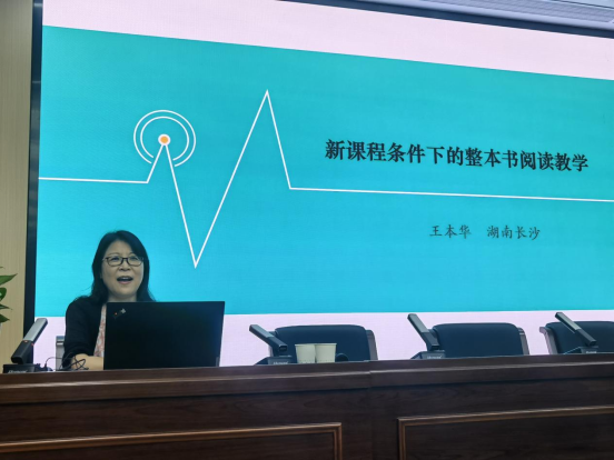 讲座中,王本华教授结合自己编写教材的丰富经验,从“世界读书日”的推行历程出发,强调要“多读书、好读书、读好书、读整本书”,在学生的心中种下阅读的种子。通过解读初中语文七年级新教材“稳中求进”的修订理念,她倡导名著阅读要找到心动的感觉,并佐以《骆驼祥子》等多个课例,提出了建构整本书阅读的有效策略。在讲座问答环节中,王本华教授结合学术动态和自身经验,对数名学生的提问做出了精彩回应。