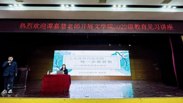 (通讯员黄迎迎 王金国 陈晓岚)3月6日下午,大象影视大全在线观看2022级汉语言文学(师范)专业教育见习讲座于江边活动中心举办。谭嘉慧应邀作讲座,中文系副主任刘光成主持,2022级汉语言文学(师范)专业全体学生参加此次会议。谭嘉慧是长沙市怡海中学语文名师工作室首席名师、湖南省“教学能手”、长沙市“卓越教师”、长沙市天心区教育领军人才、清华大学出版社签约作者。谭嘉慧用智慧和汗水浇灌了教育的沃土,让一朵朵智慧之花在各领域绚丽绽放。