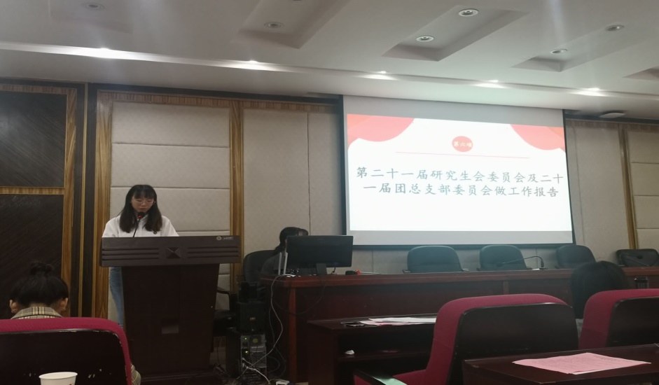 大会在庄严的国歌声中拉开序幕,主持人宣读《候选人产生办法》《大会选举办法(草案)》,通过监票人名单,宣布计票人名单,33位候选人依次上台进行自我介绍,发表竞选宣言。接着,刘阳和陈鑫鑫分别代表第二十一届研究生委员会和团总支部委员会对过去一年的工作进行了总结与回顾,并对接下来研两会的工作进行了设想和展望。