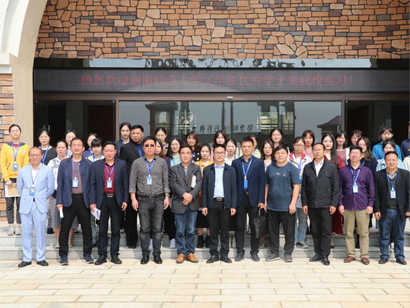会议结束后,全体与会人员于行政楼下合影留念。任海波带领实习队员们与任课老师洽谈对接,进行具体实习工作的指导。至此,我院17级赴湘阴文郡洋沙湖中学实习队见面会结束。