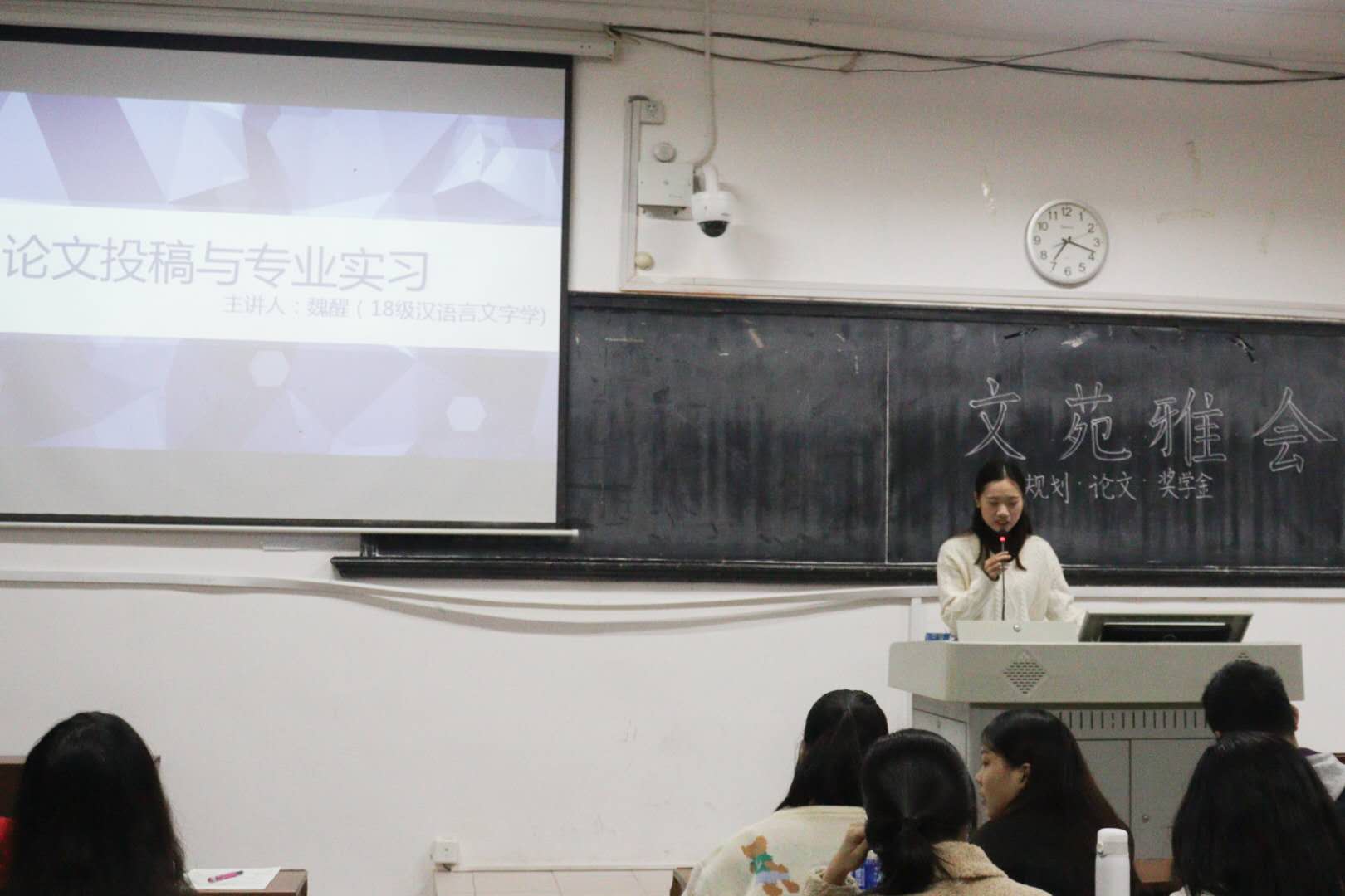 (通讯员郭帆)10月21日晚7点,大象影视大全在线观看研究生学生会在大象影视大全在线观看317举办了第二届“文苑雅会”学术沙龙活动。本次沙龙围绕“规划•论文•奖学金”主题展开,主讲人分别是18级写作学专业聂文涛、18级当代文学专业李岳峰、18级汉语言文字学专业魏醒以及19级现代文学专业申晓。本次沙龙由学术部郑明月主持。